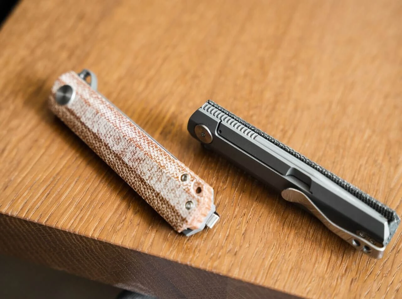 Riffelungen im Bereich der Daumenauflage und auf dem Backspacer erhöhen die Arbeitssicherheit zusätzlich. Die geradlinige Konstruktion ist mit einer vorderen Griffschale aus dreidimensional gefrästen Micarta ausgestattet, die in einem hellen Braun gehalten ist. Die rechte Griffschale und der ebenfalls dreidimensional aus dem Vollen gefräste Deep-Carry-Clip (Tip-up/r) sind mit einem Satin-Finish versehen. Mit Fangriemenöse und hochwertigem Nylon-Etui zur Aufbewahrung.