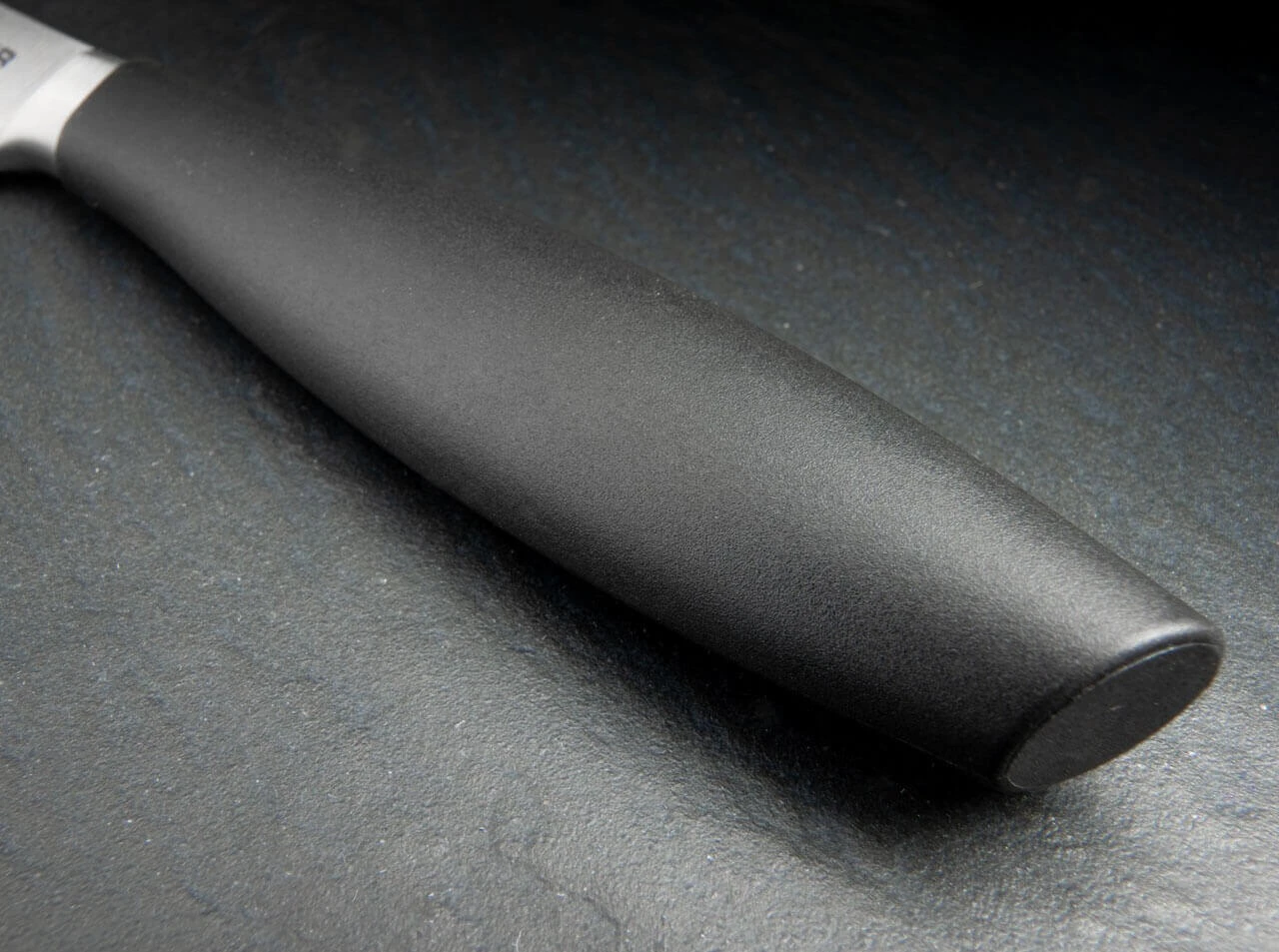 Der geschmiedete Kropf bietet jederzeit einen sicheren Griff und schützt bei einem Abrutschen vor möglichen Verletzungen. Als besonderes Design-Feature ist der Klingenrücken bei allen Messern dieser Serie sanft abgerundet. So liegt das Messer in jeder Griffposition angenehm in der Hand und verhindert auch bei stärkerem Druck auf den Klingenrücken im Wiegeschnitt ein unangenehmes Druckgefühl in der Hand.