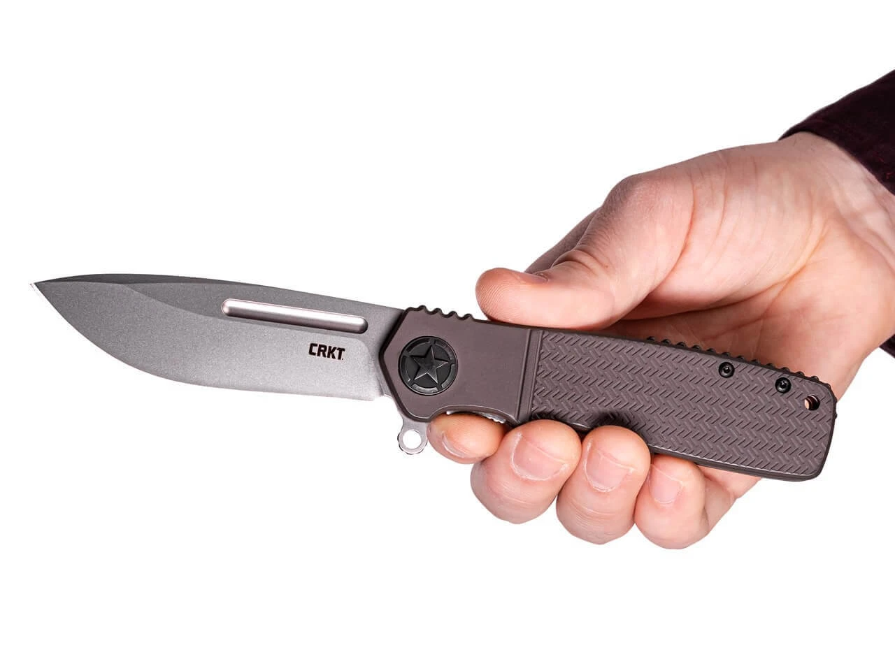 Der Begriff Homefront (Heimatfront) entstand im Zuge des Ersten Weltkrieges und beschreibt die Einbeziehung der Zivilbevölkerung in Kriegshandlungen wie beispielsweise als Arbeitskraft für die Rüstungsindustrie oder Militärlogistik. Das CRKT Homefront greift das klassische Militärdesign auf und versieht den Assisted Opener mit einer kugelgelagerten 12C27 Klinge, die wahlweise per Flipper oder Nagelhau öffnet. Höchste Robustheit verspricht der Aluminiumgriff, der das Messer zudem sehr leicht macht. Mit dem US-Army Stern auf der Klingenachsschraube setzt Designer Ken Onion einen dekorativen Akzent. Der Liner Lock sichert die Klinge zuverlässig und kann einhändig bedient werden. Mit Deep Carry Clip (Tip-up/r).