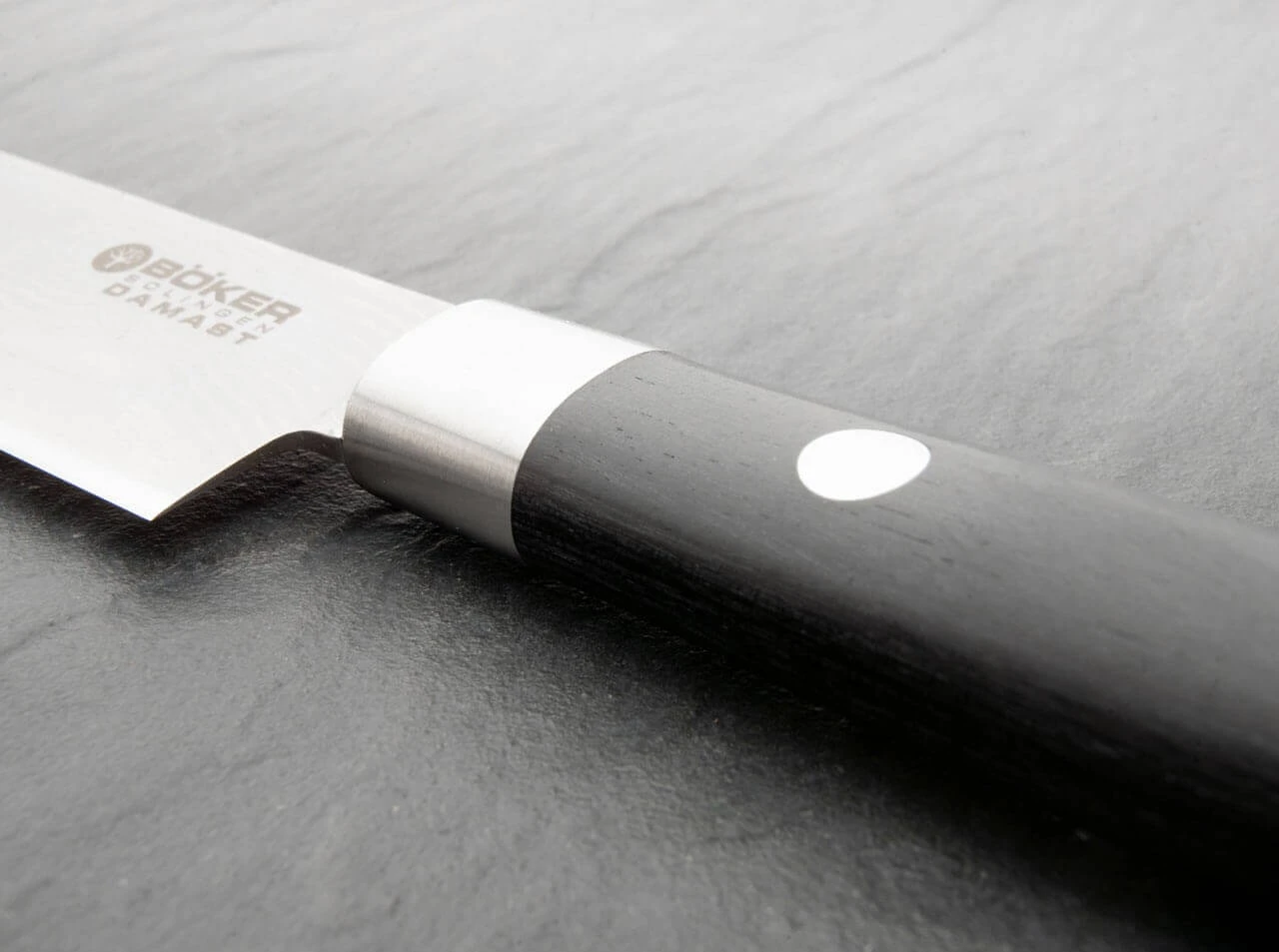 Die Kochmesser-Serie Böker Damast Black verbindet traditionell japanische Griffformen aus schwarzem heimischen Schichtholz mit rasiermesserscharfen Klingen aus rostfreiem Damast mit 37 Lagen Stahl, die sich durch eine wunderschöne Maserung auszeichnen. Der extrem schnitthaltige Kern der Damastklinge besteht aus dem Hochleistungsstahl VG-10. Die spürbare Schärfe beim Schneiden ist atemberaubend und lässt das Kochen zum Erlebnis werden. Die japanische Bauweise des Messergriffs mit den fein mattierten Edelstahlzwingen gibt der Serie ihren besonderen Charakter.