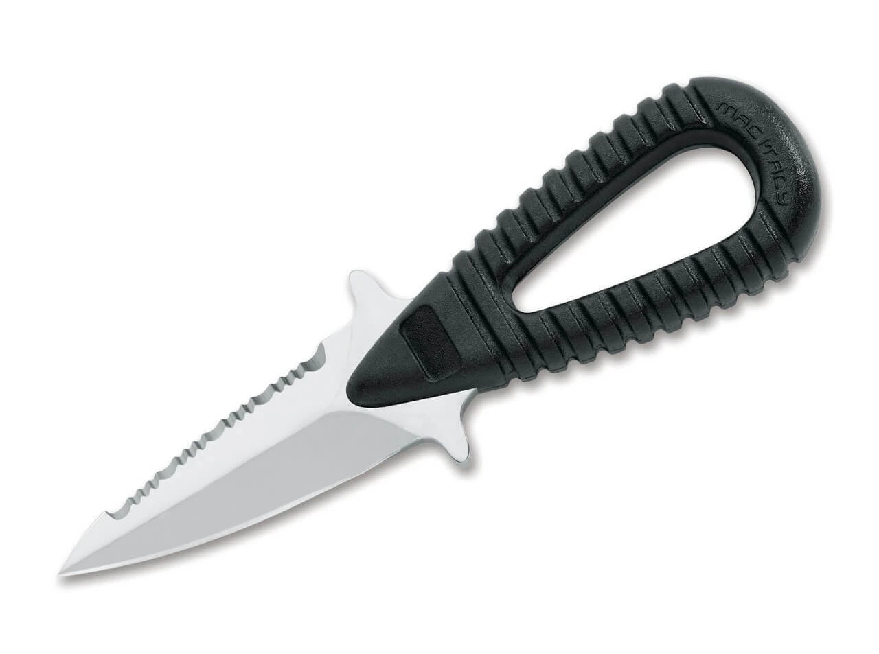 Das professionelle Tauchermesser Microsub von MAC ist mit einer Klinge aus 4116 ausgestattet, die zusätzlich über einen bissigen Wellenschliff verfügt. Der schwarze Griff aus rutschfestem ABS liegt auch unter Wasser sicher in der Hand. Lieferung mit Polypropylen-Scheide mit Gummibändern für Beine oder Arme. Das Messer kann aber auch als Neck Knife getragen werden.