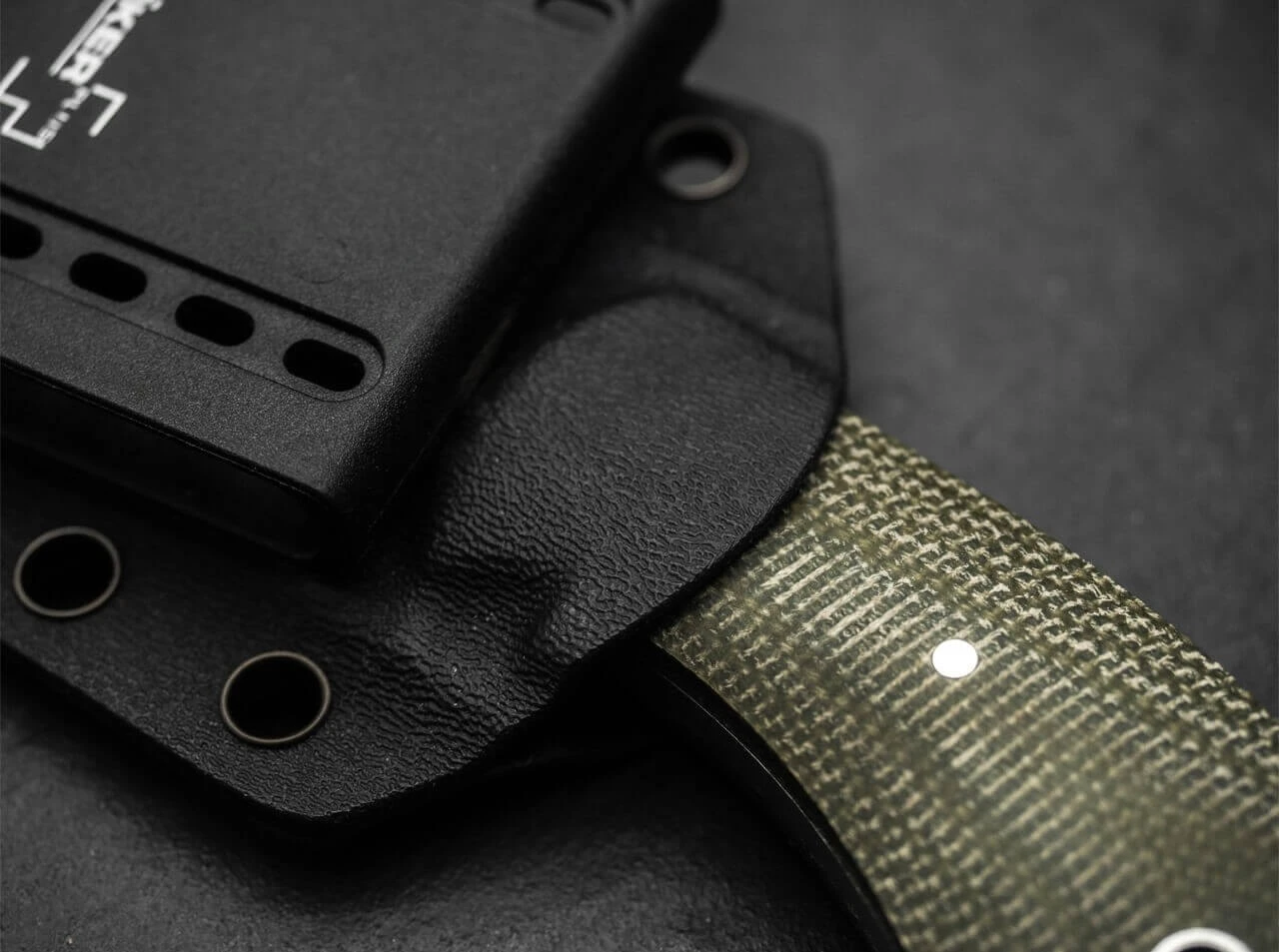 Die kurze Clippoint-Klinge des Messers wird aus D2 gefertigt und ist mit einer ausgeprägten Fehlschärfe und einem unaufdringlichen Handschutz versehen. Die konturierten Griffschalen bestehen aus rutschfestem Micarta und liegen auch bei Nässe stets sicher in der Hand. Mit verstärkter Fangriemenöse, passgenauer Kydexscheide und praktischem Gürteladapter.
