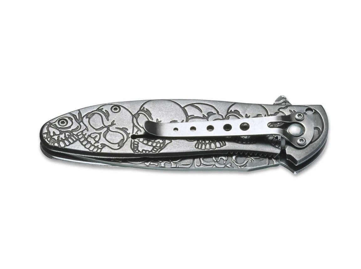 Das Magnum Dia de los Muertos ist ein originelles Taschenmesser, verziert mit zahlreichen Totenköpfen. Es hat seinen Namen vom Tag der Toten, einem der wichtigsten mexikanischen Feiertage. Der geprägte Griff lässt die Schädel ungemein plastisch wirken. Auch die 440er Klinge ist mit zahlreichen Knochen und Schädeln verziert und kann leicht per Flipper federunterstützt geöffnet werden. Die Schattierung der Schädel lässt die Totenköpfe hervorstehen. Mit Linerlockverschluss und Clip.