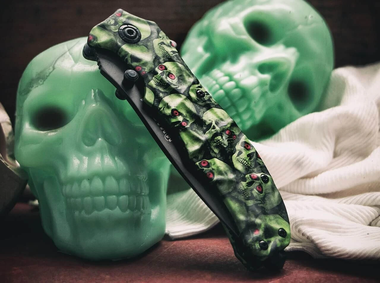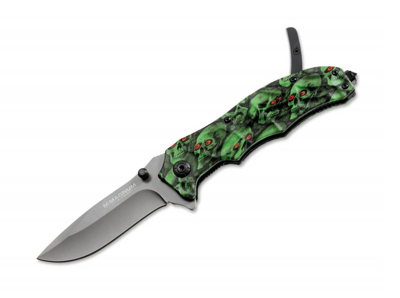 Das Magnum Hades Rescue ist ein Taschenmesser mit aufregendem Griffdesign, das aufgrund der grünen Totenköpfe mit leuchtend roten Pupillen sofort ins Auge sticht. Die Klinge aus 440er Edelstahl ist titanbeschichtet und arretiert sicher per Linerlock. Der Glasbrecher und der ausklappbare Gurtschneider sind unverzichtbare Features für ein Rettungsmesser, um ein Treffen mit Hades noch ein wenig hinaus zu zögern. Mit Clip.