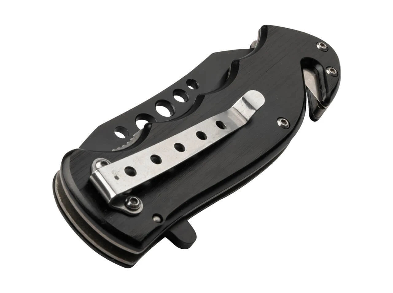 Das Magnum Special Forces ist ein funktionales Rettungsmesser, das den weltbekannten Elite-Einheiten der amerikanischen Streitkräfte gewidmet ist. Der leichtgewichtige Griff aus schwarz beschichtetem Aluminium trägt ein Emblem mit dem Wappen der Special Forces. Die rostfreie Klinge aus 440A öffnet federunterstützt per Flipper und wird von einem stabilen Linerlock zuverlässig arretiert. Die Bohrungen verleihen der Klinge eine eigene Note und reduzieren zudem das Gewicht. Am Griffende befinden sich ein Glasbrecher und ein Gurtschneider, die das Messer für jede Notfallausrüstung prädestinieren. Mit praktischem Deep-Carry-Clip (Tip-down).