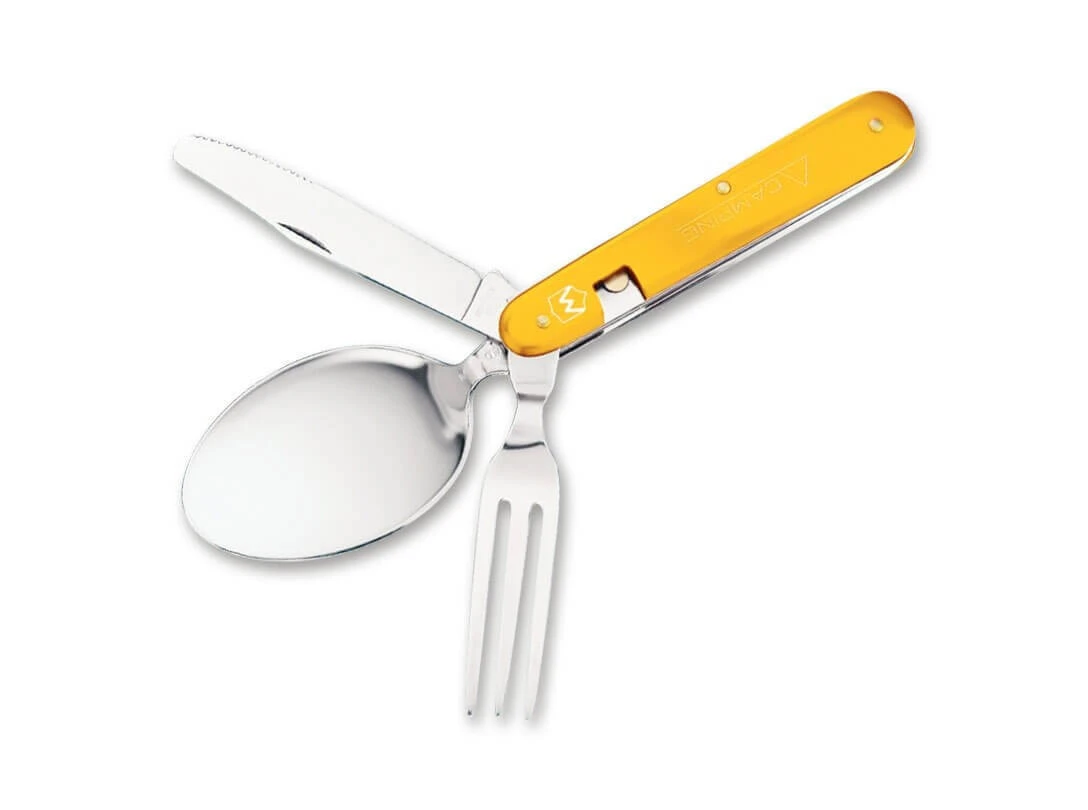 Mercury aus Maniago ist hauptsächlich bekannt für seine klassischen Taschenmesser mit Hirschhornbeschalung. Mit einem farbenfrohen Konzept präsentiert der italienische Hersteller das praktische Campingbesteck Rover mit den wesentlichen Hauptbestandteilen Messer, Gabel und Löffel. Verwendet wird der bewährte 420 Stahl, während der erfrischend gelbe Griff aus Aluminium besteht.
