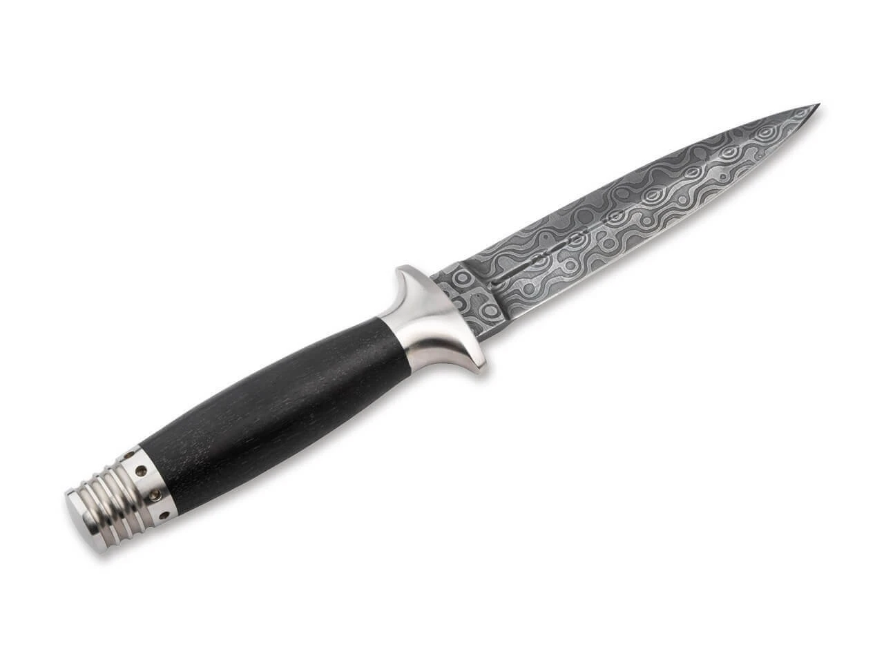 Den Stahl des MG-42 schmiedet unser langjähriger und erfahrener Partner Chad Nicols zum Herzstück des Dolches, der zweischneidig geschliffenen Klinge mit beidseitiger dezenter Hohlkehle. Das gewählte Damast-Muster Low Layer Raindrop (40 Lagen) kommt durch das symmetrische Profil der Klinge hervorragend zur Geltung.