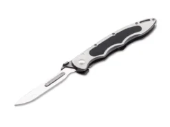 Besonders robuster Griff aus rostfreiem Stahl mit G10-Einlage und Framelock-Verriegelung. Besonders stabile Klinge. Taschenclip. Lieferung mit Etui, 12 Ersatzklingen und praktischem Blade Remover zum Wechseln der Klinge.
