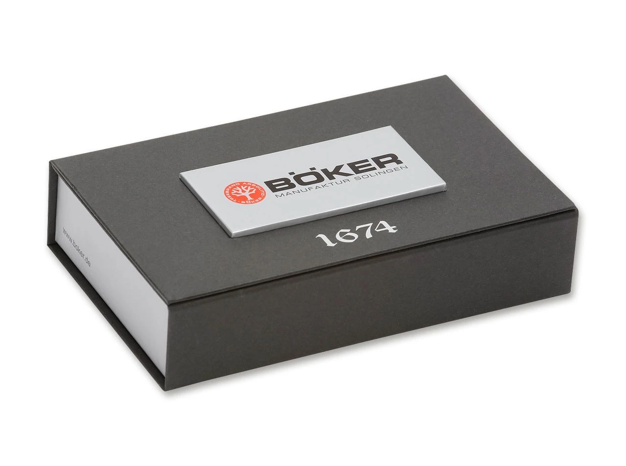 Seit unserer Gründung im Jahr 1869 durch Heinrich Böker verstehen wir uns als geschichtsbewusste Manufaktur. Mit seit jeher kontinuierlicher Firmenhistorie in Solingen fühlen wir uns dem Erbe und unserer Tradition ebenso verpflichtet wie den Themen Innovation und moderne Technologie. Die außergewöhnlich vielfältige Modellpalette unserer Solinger Manufaktur unterstreicht diese Unternehmensphilosophie. 1865 wurde von Robert Böker, einem Cousin von Heinrich, Böker Mexico gegründet. Das Unternehmen befindet sich auch heute noch in Besitz der Familie Böker und wird in 4. Generation geführt. Anlässlich des 150-jährigen Jubiläums von Böker Mexico wurden uns vor Ort hochinteressante, uns bis dato unbekannte Unterlagen zugänglich gemacht, die ein neues Licht auf die Geschichte der Marke Böker werfen. Zurück in Solingen, haben wir uns in Zusammenarbeit mit Historikern aus dem Bergischen Land unverzüglich an Recherchearbeiten gemacht und konnten verifizieren, dass die Familie Böker das Wappen mit dem berühmten Baum erstmals im Jahr 1674 als „Hausmarke“ eintragen ließ. Dieses historische Wappen zeigt einen grünen Baum auf silberfarbenen Grund am Ufer eines blauen Flusses. Wir verstehen dies als direkten Hinweis auf die schon damals durch Wasserkraft angetriebenen Schleifsteine. Die Geschichte des Böker Baums ist also nachweislich über 343 Jahre alt! Selbstverständlich haben wir diese Entdeckung zum Anlass genommen eine Sonderserie zu konzipieren, um das Jahr der Markeneintragung gebührend zu feiern. Für die einheitliche Beschalung der Serienmodelle fiel unsere Wahl mit Amboina Wurzelholz auf eines der beliebtesten Hölzer, das hier ausschließlich stabilisiert zum Einsatz kommt. Die blaugepließteten Klingen tragen das traditionelle Solinger Klingenfinish. Die Auswahl der Modelle umfasst Klassiker ebenso wie bedeutende Modelle der jüngeren Geschichte. Jedes Messer ist streng limitiert auf 343 Exemplare. Auslieferung mit Zertifikat und individueller Seriennummer.