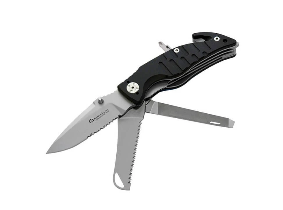 Das Maserin Rescue-2 III ist ein praktisches Rettungsmesser mit Gurtschneider, Glasbrecher, Säge und Schraubenzieher. Die Klinge mit Teilwellenschliff wird aus N690 gefertigt und durch einen Linerlock verriegelt. Als Öffnungshilfe kommt ein klassischer Daumenpin zum Einsatz. Der schwarze Aluminiumgriff ist stark strukturiert und liegt so auch bei Nässe und Feuchtigkeit sicher in der Hand. Mit abnehmbarem Clip.