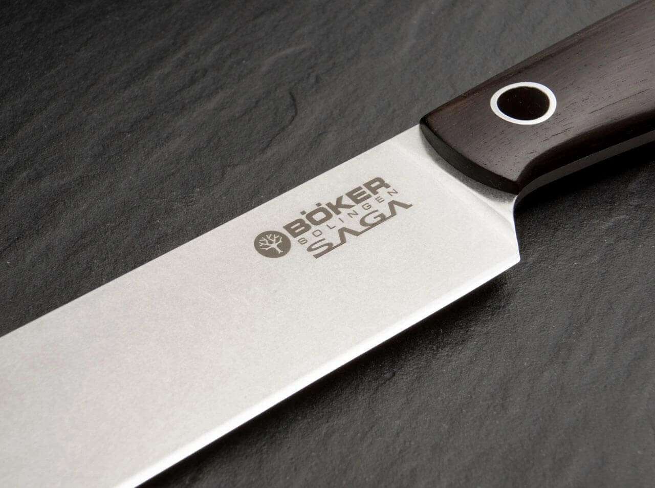 Die sanft geschwungenen Griffe werden aus exklusiv zertifiziert importiertem Grenadillholz gefertigt. Mit seiner hohen Härte und Dichte ist Grenadill u.a. fest etabliert im europäischen Holzblasinstrumentenbau. Schon bei der ersten Kontaktaufnahme mit der Messerserie Böker Saga wird die gelungene Ergonomie deutlich: Jeder Bogen, jeder Schwung in der Linie schmiegt sich an seine Stelle in der Hand und vermittelt eine absolute Kontrolle und ein überragendes Schneiderlebnis. Das schwalbenschwanzartig verbreiterte Griffende der größeren Modelle bringt zusätzliche Griffsicherheit. Die hohe Stabilität verdankt Böker Saga dem komplett durchgehenden Erl, der das Messer (in der gleichen Bauweise wie viele Jagdmesser) von der Klingenspitze bis zum Griffende durchzieht. Für eine optimale Schneidleistung steht nicht nur der komplette Flachschliff der Klinge mit Stonewash-Finish, sondern auch die Wahl von 440C als Klingenstahl, der hinsichtlich Schnitthaltigkeit und Korrosionsbeständigkeit übliche Küchenmesserstähle weit übertrifft. Dieses in einem speziellen Schleifverfahren erzeugte Oberflächenfinish zeichnet sich durch hervorragende Gleiteigenschaften im Schnittgut aus und fördert so die ohnehin ausgezeichnete Schneidleistung. Des weiteren ist die Mikrostruktur des Stonewash-Finish extrem unempfindlich gegen Kratzer, da diese sich optisch in der Struktur oft verlieren..Den besonderen Akzent setzen die großen Hohlnieten, die unverkennbar die Handschrift von Jesper Voxnæs tragen.