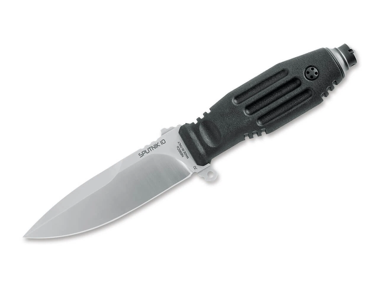 Die FKMD Sputnik Serie glänzt vor allem mit besonders hohem Gebrauchswert und einer extrem sicheren Handlage. Durch das schwarze TPR Griffmaterial ist das Sputnik 10 auch bei Nässe oder Kälte sehr komfortabel und sicher zu handhaben, wozu die zahlreichen Mulden und Rillen ihren Teil beitragen. Das kleine integrierte Parierelement trägt ebenso eine Öse wie der Glasbrecher im Griffende, wodurch sich das feststehende Messer zum Beispiel auch an einem Stock festbinden lässt. Die satinierte Klinge aus N690 ist mit ihrer außergewöhnlichen Stärke von 5mm optimal dimensioniert, um Schneidpotential und Stabilität zu vereinen. Die Fehlschärfe der Drop-Point Klinge unterstreicht den taktischen Charakter des Einsatzmessers. Die äußerst funktionale symmetrische Scheide ist aus GFK gefertigt und sitzt in einem Molle-kompatiblen Nylonhalter mit Gürtelschlaufe und abnehmbaren Beingurten.